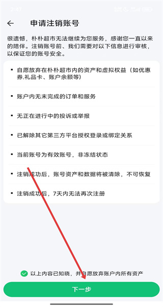 3、在跳轉(zhuǎn)到申請(qǐng)注銷賬號(hào)頁面中,瀏覽完注意事項(xiàng)后勾選已知曉按鈕,點(diǎn)擊下一步按鈕。
