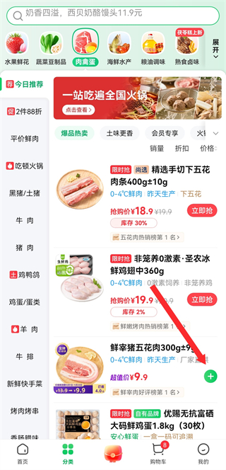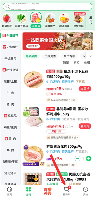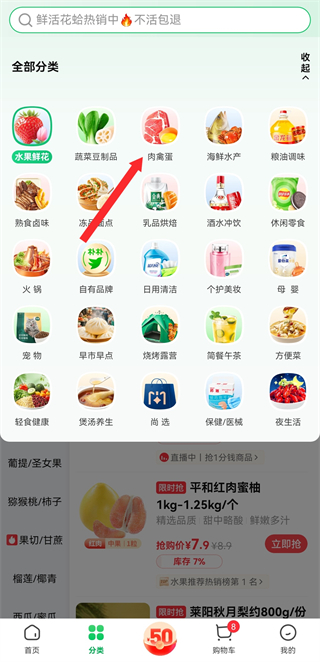 2、在全部分類頁面中,點(diǎn)擊肉禽蛋分類,進(jìn)入肉禽蛋商品列表頁面。