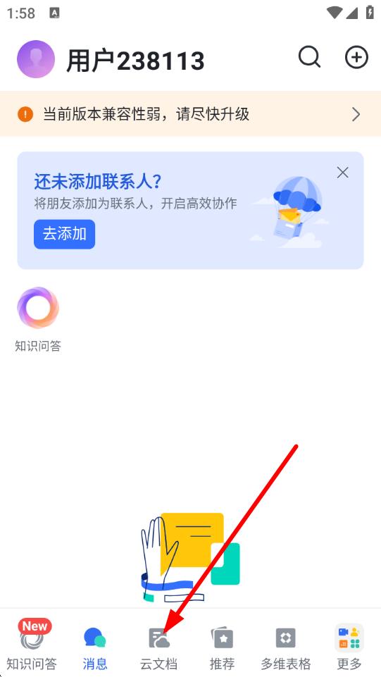 1、在飛書主界面點(diǎn)擊底部云文檔,進(jìn)入云文檔頁(yè)面。
