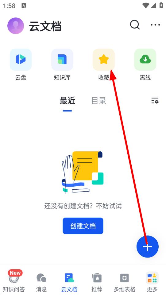 2、在云文檔頁(yè)面點(diǎn)擊上方收藏,查看收藏內(nèi)容。