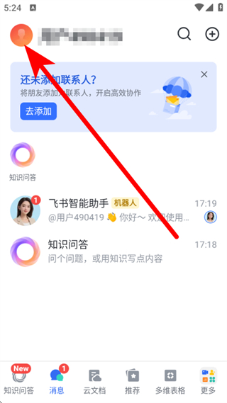 1、在飛書的界面,我們需要點(diǎn)擊左上角頭像,展開個(gè)人菜單。