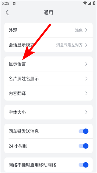 4、在通用設(shè)置頁(yè)面,點(diǎn)擊顯示語(yǔ)言,即可選擇并更改飛書的顯示語(yǔ)言。
