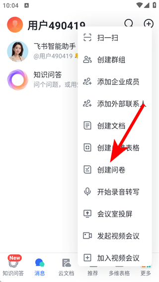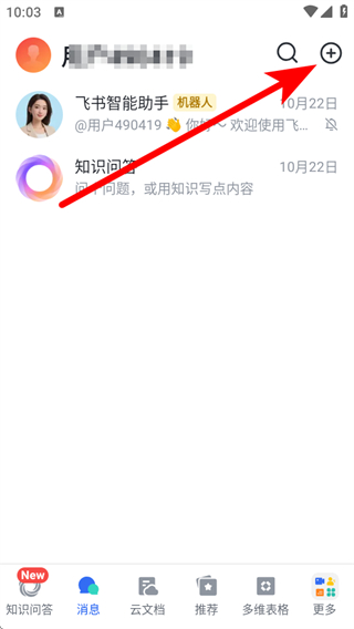 1、打開飛書APP,需要點(diǎn)擊界面右上角的+按鈕,展開功能菜單。