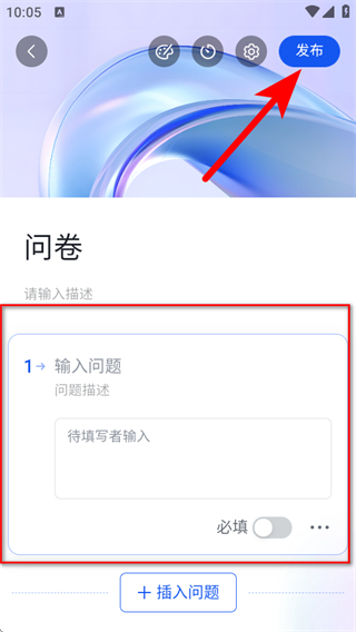 3、在問(wèn)卷編輯頁(yè)面,輸入問(wèn)卷描述,添加問(wèn)題并設(shè)置相關(guān)選項(xiàng)后點(diǎn)擊發(fā)布。