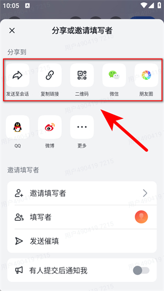 4、在分享界面選擇合適的分享方式,即可將問(wèn)卷分享給填寫者,完成創(chuàng)建操作。
