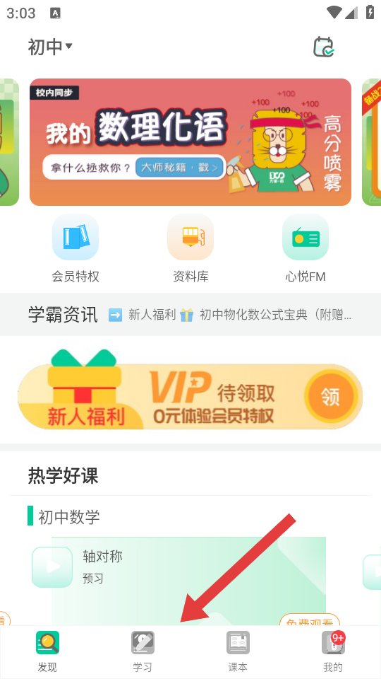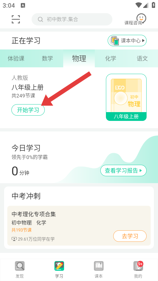 1、在首頁點(diǎn)擊學(xué)習(xí),進(jìn)入學(xué)習(xí)頁面,可選擇對應(yīng)學(xué)科和教材。