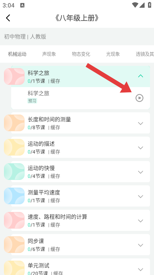 3、在章節(jié)列表頁面,選擇具體章節(jié),點(diǎn)擊播放按鈕,進(jìn)入課程詳情頁面。