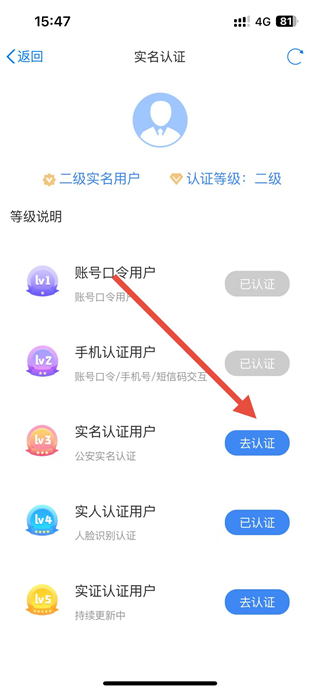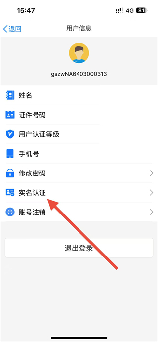 3、在用戶信息頁面中,選擇實名認(rèn)證選項,進(jìn)入實名認(rèn)證等級頁面。