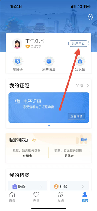2、進(jìn)入個人中心后,點擊用戶中心選項,進(jìn)入用戶信息頁面。