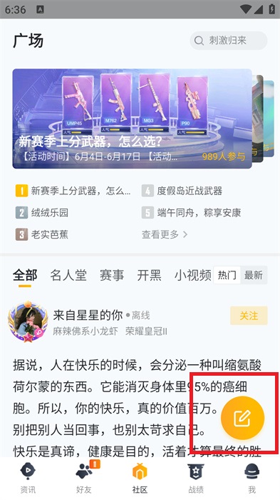 2、在社區(qū)頻道,點(diǎn)擊其中的【書簽】圖標(biāo),就可以進(jìn)入到發(fā)布動態(tài)的界面;