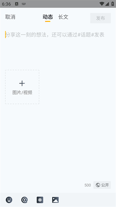 3、在動態(tài)發(fā)布界面,就可以看到文案的輸入頁面,還有圖片和視頻內(nèi)容都可以添加,然后我們就可以輸入想要發(fā)布的動態(tài);
