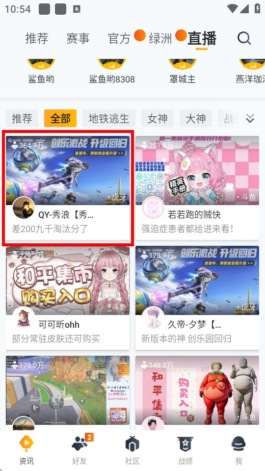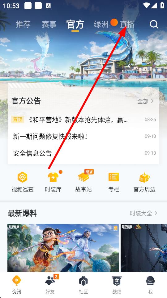1、打開和平營地APP,點(diǎn)擊上方導(dǎo)航欄中的直播選項進(jìn)入直播頁面。