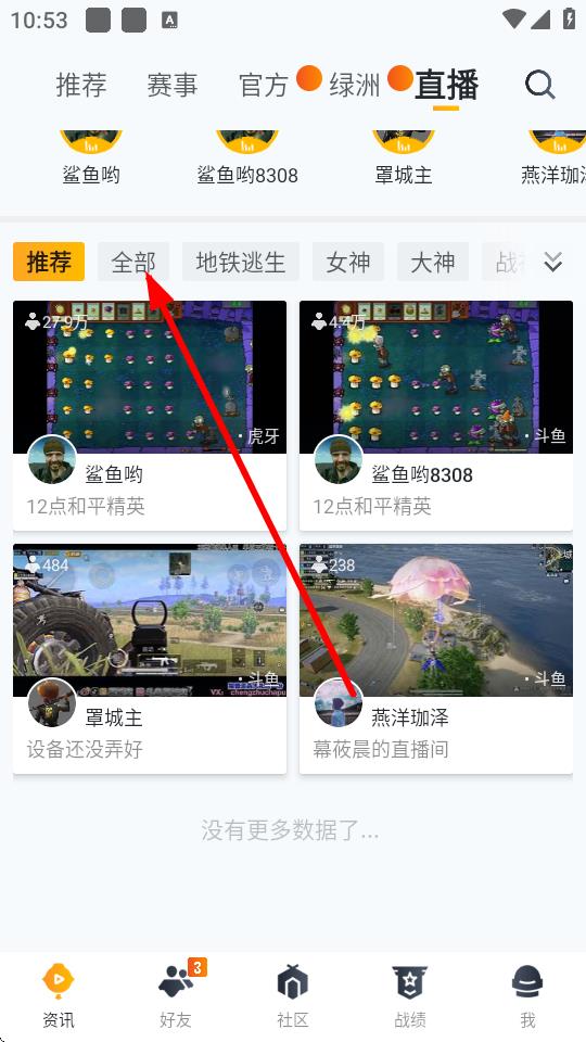 2、在直播頁面中,點(diǎn)擊全部標(biāo)簽,瀏覽各個直播間。