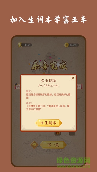 游戲中所有的成語你都可以找到注釋和出處,對你了解成語也是有幫助的。