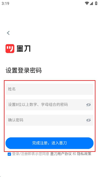 4、在該頁面填寫姓名并設置符合要求的密碼,點擊完成注冊進入墨刀。