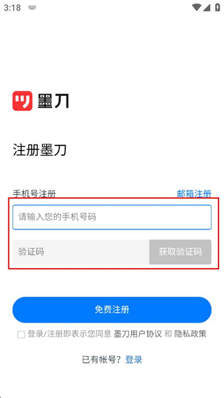 2、在注冊界面選擇手機號注冊,輸入對應的手機號碼并填寫驗證碼。