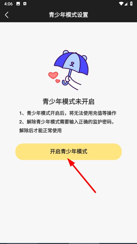 4、在青少年模式設(shè)置界面中,點擊開啟青少年模式按鈕,按照提示設(shè)置監(jiān)護密碼,即可成功開啟青少年模式。