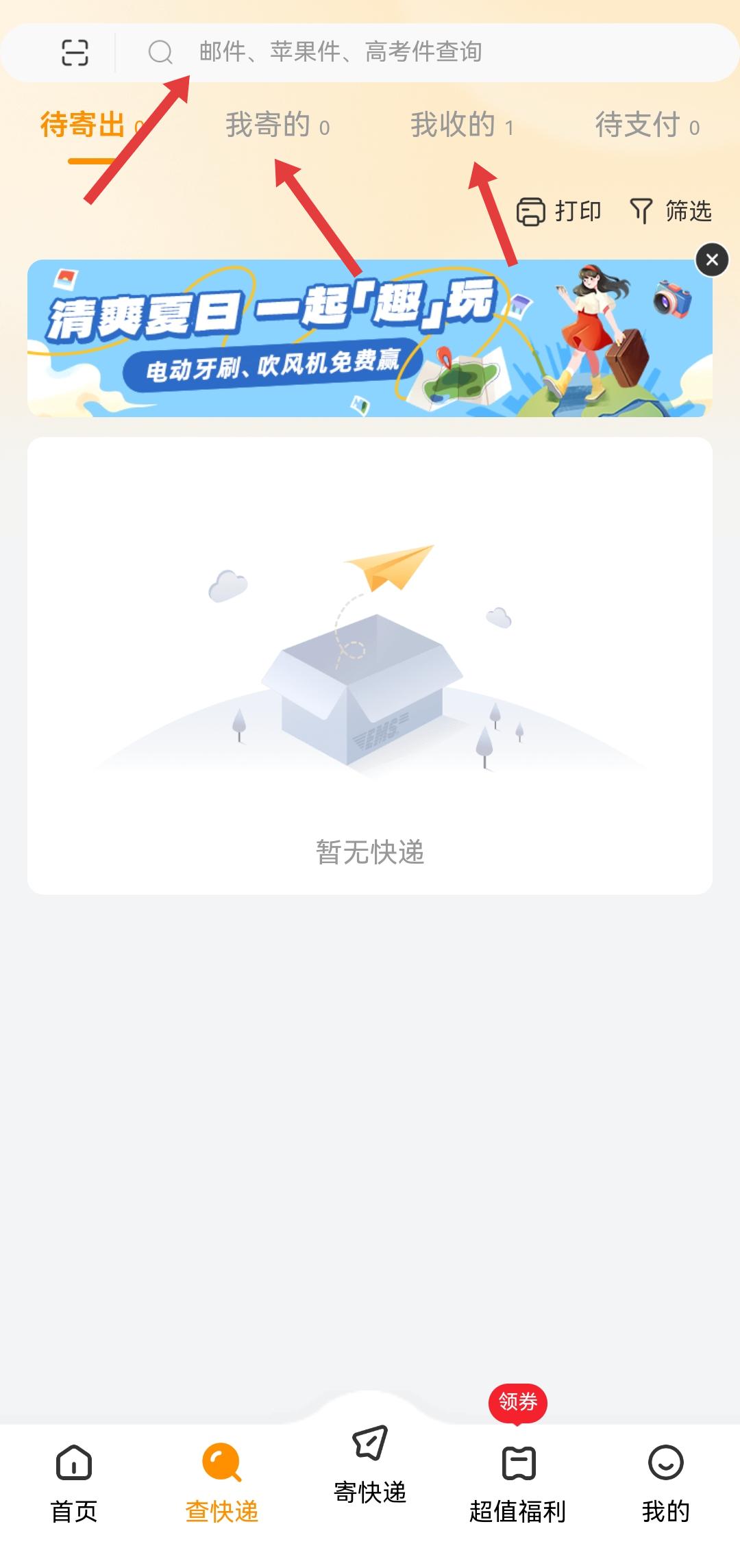 1、打開郵政EMSAPP,切換至底部導(dǎo)航欄的查快遞頁面,可通過搜索欄輸入單號(hào)查詢,或點(diǎn)擊我寄的、我收的標(biāo)簽查看對(duì)應(yīng)快遞記錄。