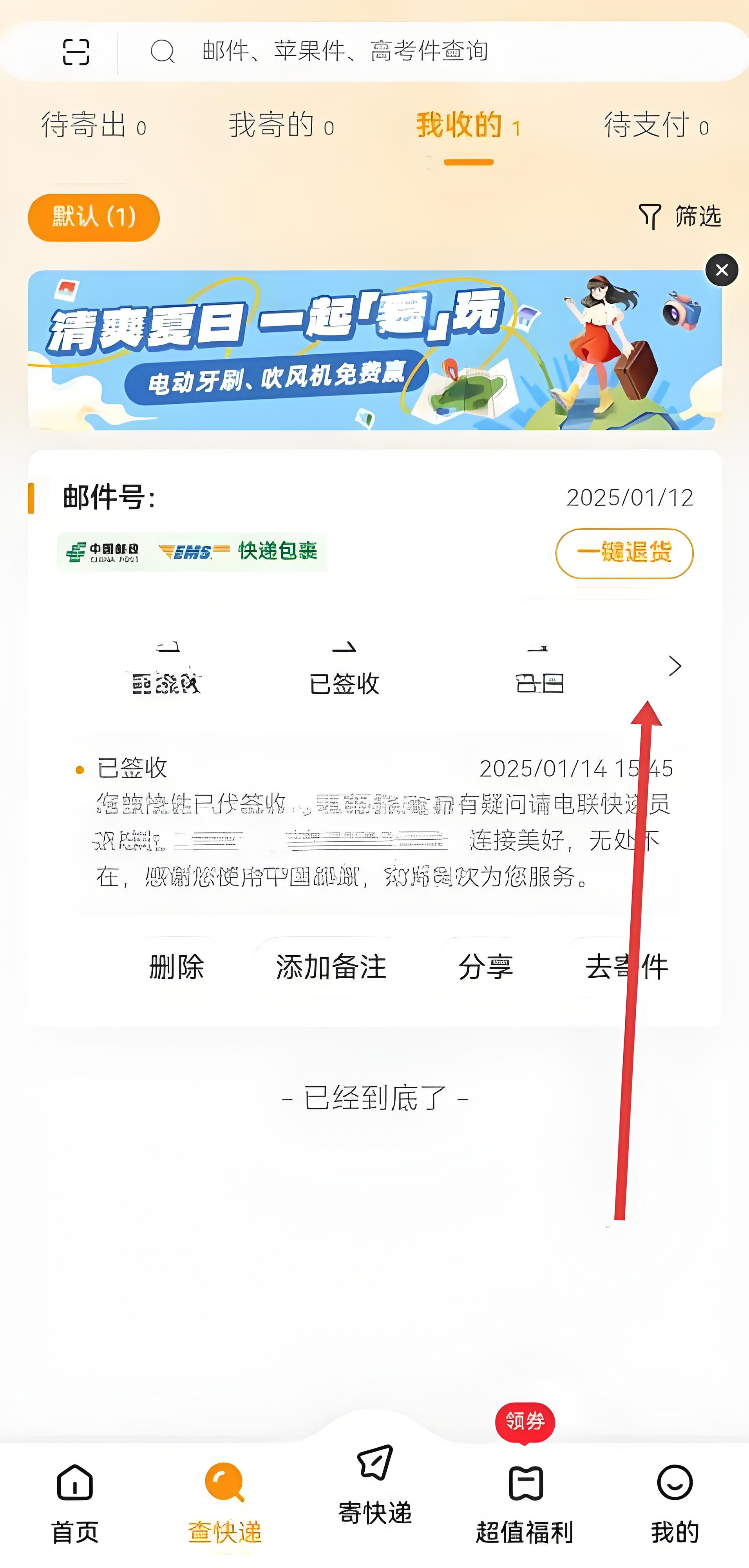 2、這里我們點(diǎn)擊我收的快遞記錄列表中,點(diǎn)擊需要查詢的快遞條目,進(jìn)入該快遞的詳情頁面。