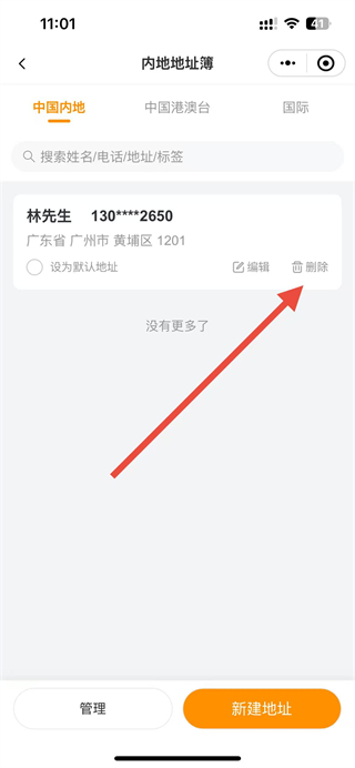 3、在內(nèi)地地址簿頁面中,找到要?jiǎng)h除的地址,點(diǎn)擊其右側(cè)的刪除選項(xiàng)。
