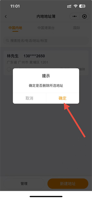 4、在彈出的提示框中,點(diǎn)擊確定按鈕即可刪除所選地址。