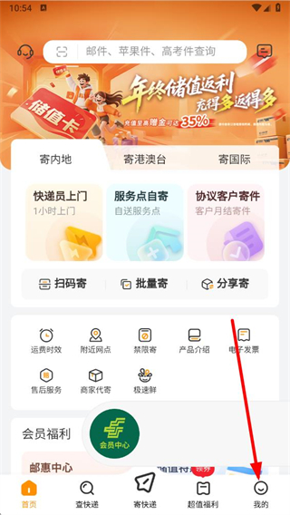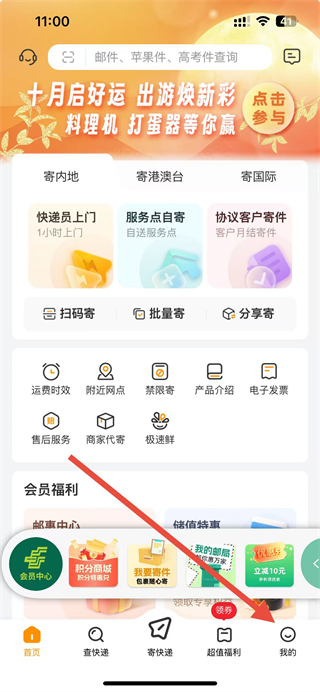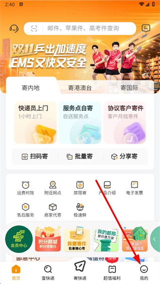 1、打開郵政EMS軟件,在首頁點(diǎn)擊右下角我的進(jìn)入個(gè)人頁面。