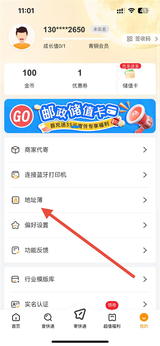 2、進(jìn)入我的頁面后,找到并點(diǎn)擊地址簿選項(xiàng)。