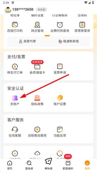 2、在個(gè)人頁面的安全認(rèn)證板塊中,找到并點(diǎn)擊多賬戶選項(xiàng)。