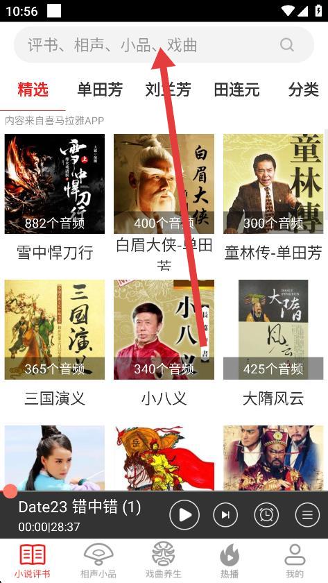 1、打開相聲評書戲曲大全app,點擊上方的搜索欄。