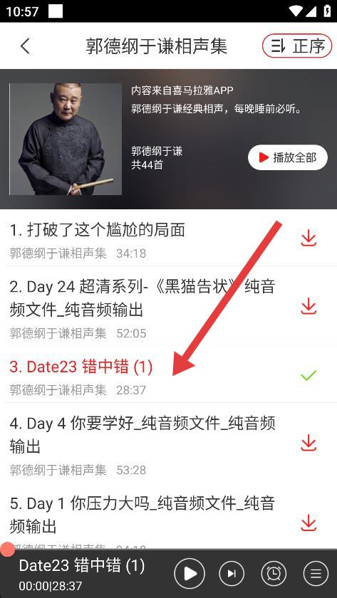 4、進(jìn)入專輯頁面后,選擇具體的相聲節(jié)目,點擊即可播放收聽。
