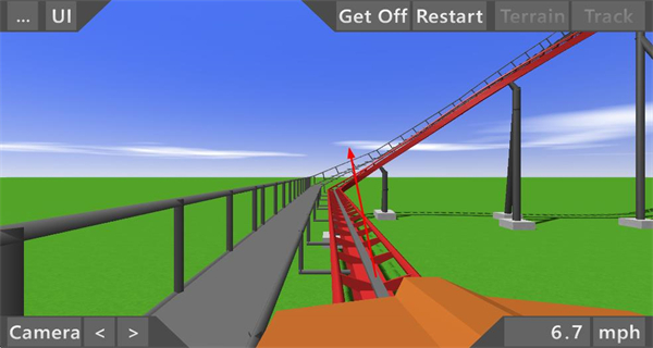 2、進(jìn)入過(guò)山車乘坐視角,跟隨軌道開始向上行駛,體驗(yàn)爬坡的過(guò)程。