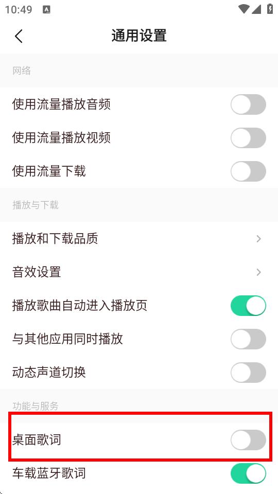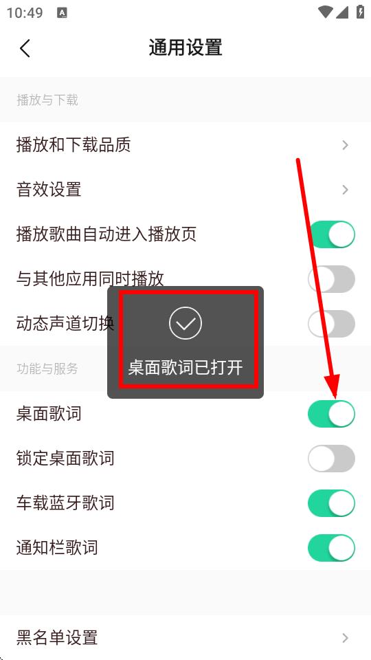 4、點(diǎn)擊其右側(cè)的開關(guān)按鈕,將其開啟即可在桌面顯示歌詞。