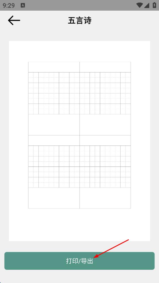 4、進入五言詩練字帖頁面后,點擊底部的打印/導(dǎo)出按鈕,進行后續(xù)打印或?qū)С霾僮鳌?