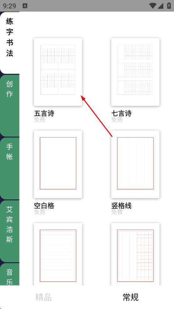 3、在常規(guī)頁面中,找到五言詩練字帖模板,點擊該模板。