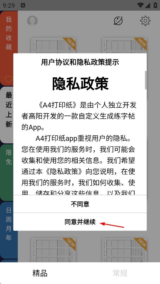1、打開A4打印紙App,會彈出用戶協(xié)議和隱私政策提示框,仔細閱讀后,點擊同意并繼續(xù)按鈕。