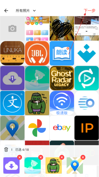 2、進入照片選擇界面后,從手機相冊中挑選需要參與拼圖的圖片,選好后點擊下一步。