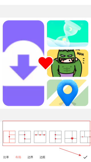 3、在拼圖編輯界面,選擇心儀的拼圖布局,調(diào)整圖片位置、大小等,完成后點擊界面右下角的對勾確認。