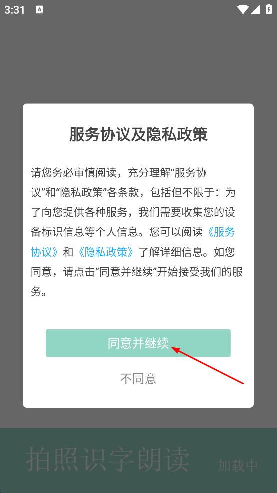 1、打開拍照識字朗讀APP,會出現(xiàn)服務(wù)協(xié)議及隱私政策頁面,仔細(xì)查看后,點擊“同意并繼續(xù)”按鈕,進(jìn)入APP主界面。