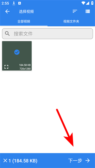 2、在選擇視頻頁面,選擇需要壓縮的視頻,點(diǎn)擊下一步按鈕。