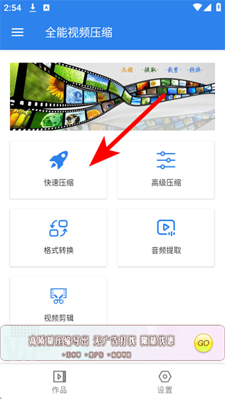 1、打開全能視頻壓縮APP,點(diǎn)擊快速壓縮選項,進(jìn)入選擇視頻頁面。