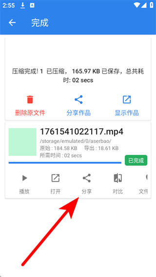 4、壓縮完成后,可點(diǎn)擊分享等按鈕進(jìn)行后續(xù)操作。