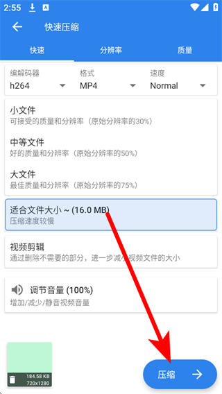 3、在快速壓縮頁面,可選擇編解碼器、格式、速度以及文件大小等參數(shù),還可進(jìn)行視頻剪輯設(shè)置,設(shè)置完成后點(diǎn)擊壓縮按鈕。