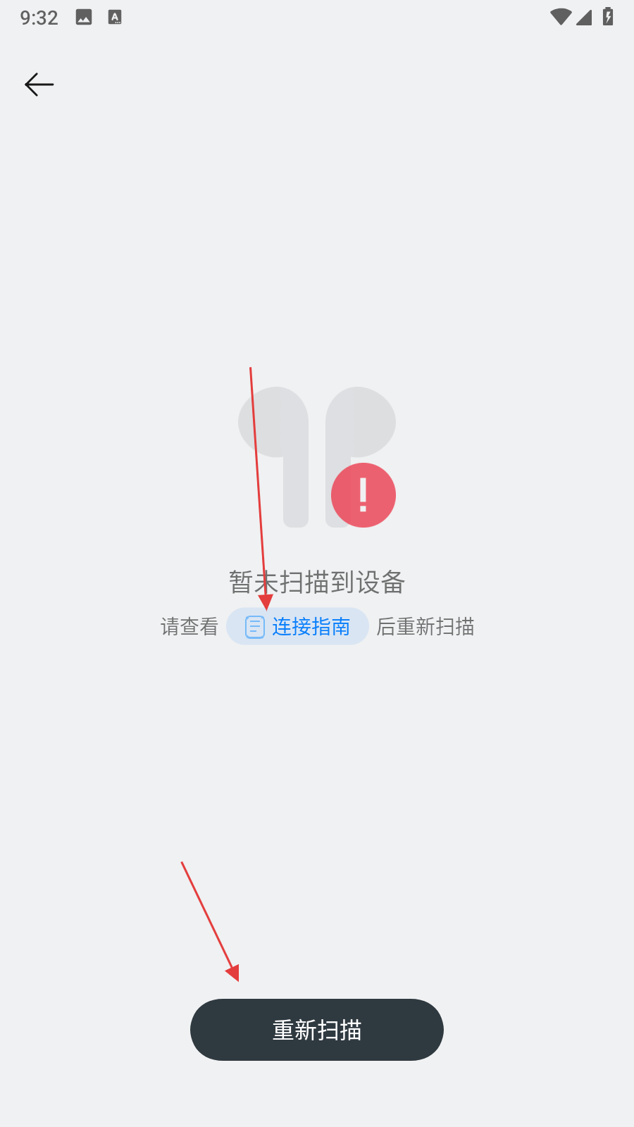 3、若暫未掃描到設備,可點擊連接指南查看連接步驟,或點擊重新掃描再次嘗試掃描設備。