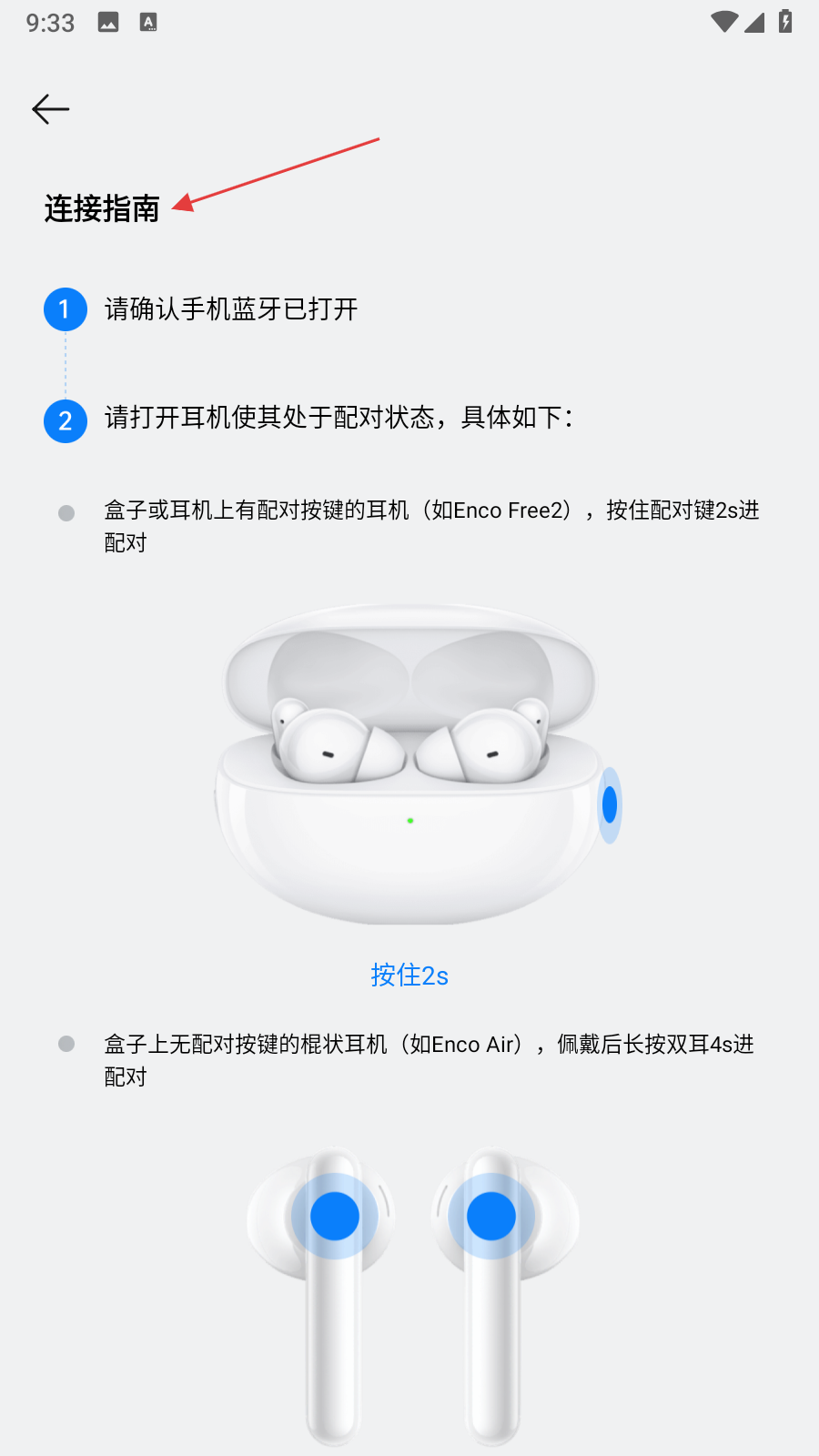 4、查看連接指南,按照提示確認手機藍牙已打開,并將耳機設置為配對狀態(tài),再返回掃描頁面完成耳機連接。