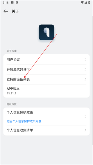 2、在關于頁面,點擊支持的設備列表選項。