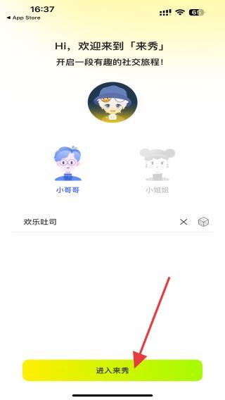3、登錄后,可設(shè)置頭像以及昵稱,設(shè)置后點(diǎn)擊進(jìn)入來秀的按鈕。