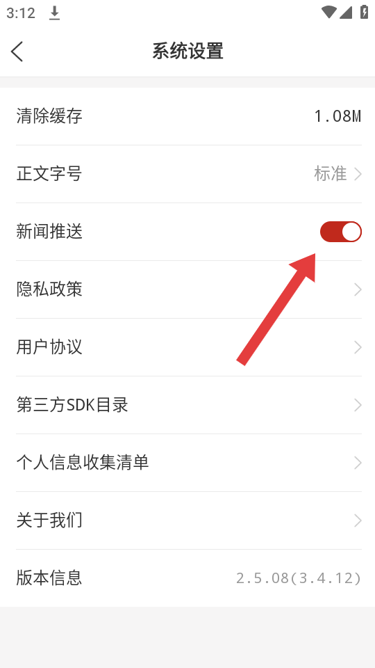 3、在系統(tǒng)設(shè)置界面,點(diǎn)擊新聞推送右側(cè)的開關(guān)按鈕,將它開啟顯示紅色就代表已經(jīng)開啟推送,即可接收新聞推送。