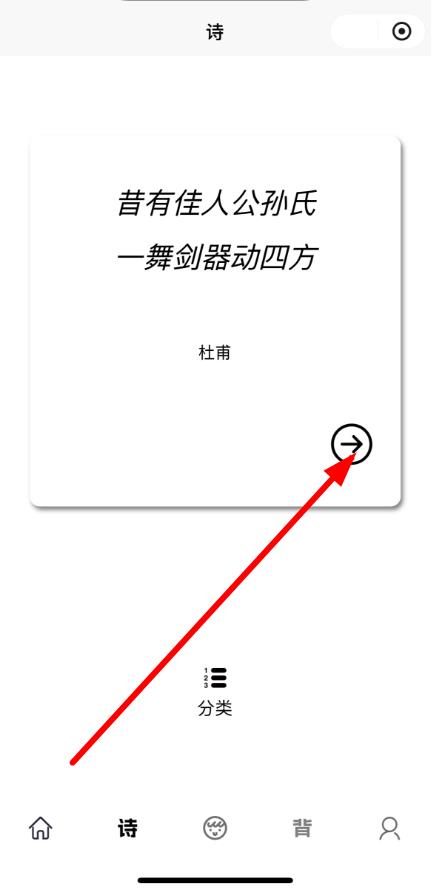 2、在詩(shī)詞界面瀏覽各類詩(shī)詞,看到感興趣詩(shī)詞如昔有佳人公孫氏,點(diǎn)擊右側(cè)箭頭。