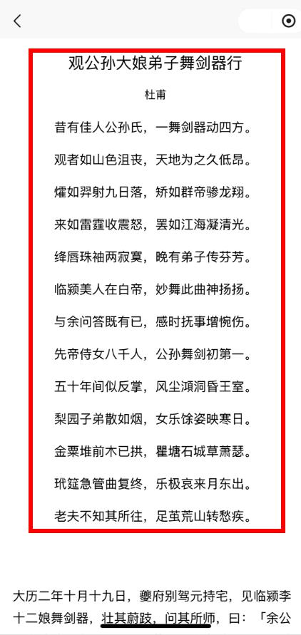 3、進(jìn)入詩(shī)詞詳情頁(yè),可閱讀詩(shī)詞全文,如杜甫的觀公孫大娘弟子舞劍器行。
