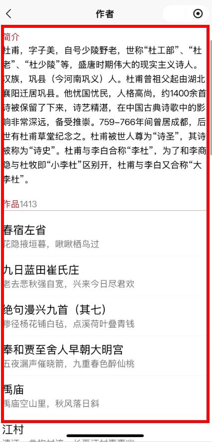 4、點(diǎn)擊作者名字,可查看作者簡(jiǎn)介及更多作品,如杜甫的簡(jiǎn)介及其他作品列表,輔助口才訓(xùn)練學(xué)習(xí)。